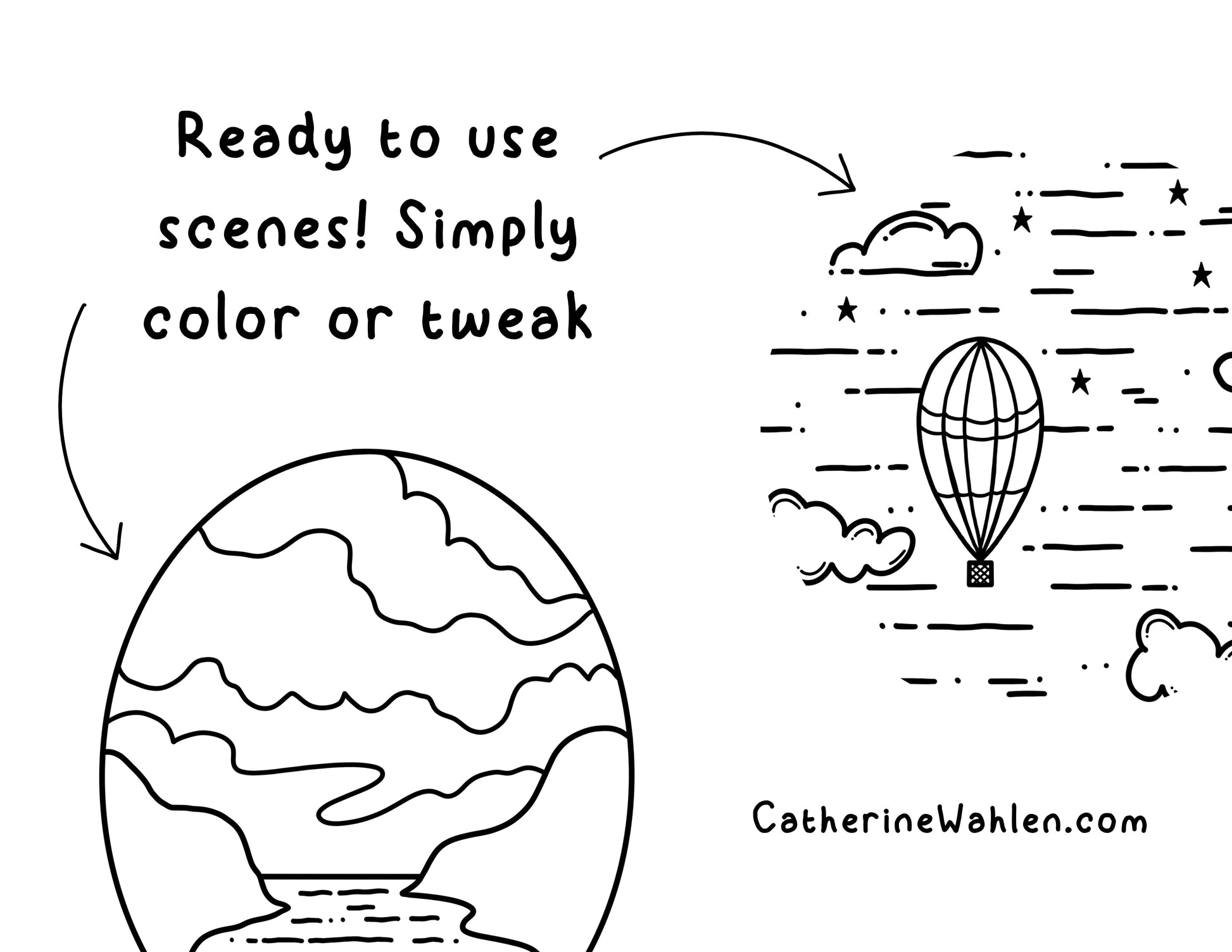 - 10 Pre Made scenes for you to use as end products! Simply color or customize