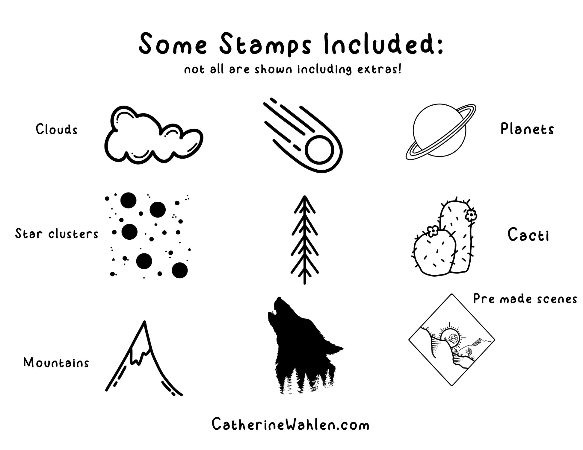 - Extras include: silhouette stamps, line drawings for you to draw inside of, wolfs head, bison, hot air balloon, tents, hammocks, and even a camper van!