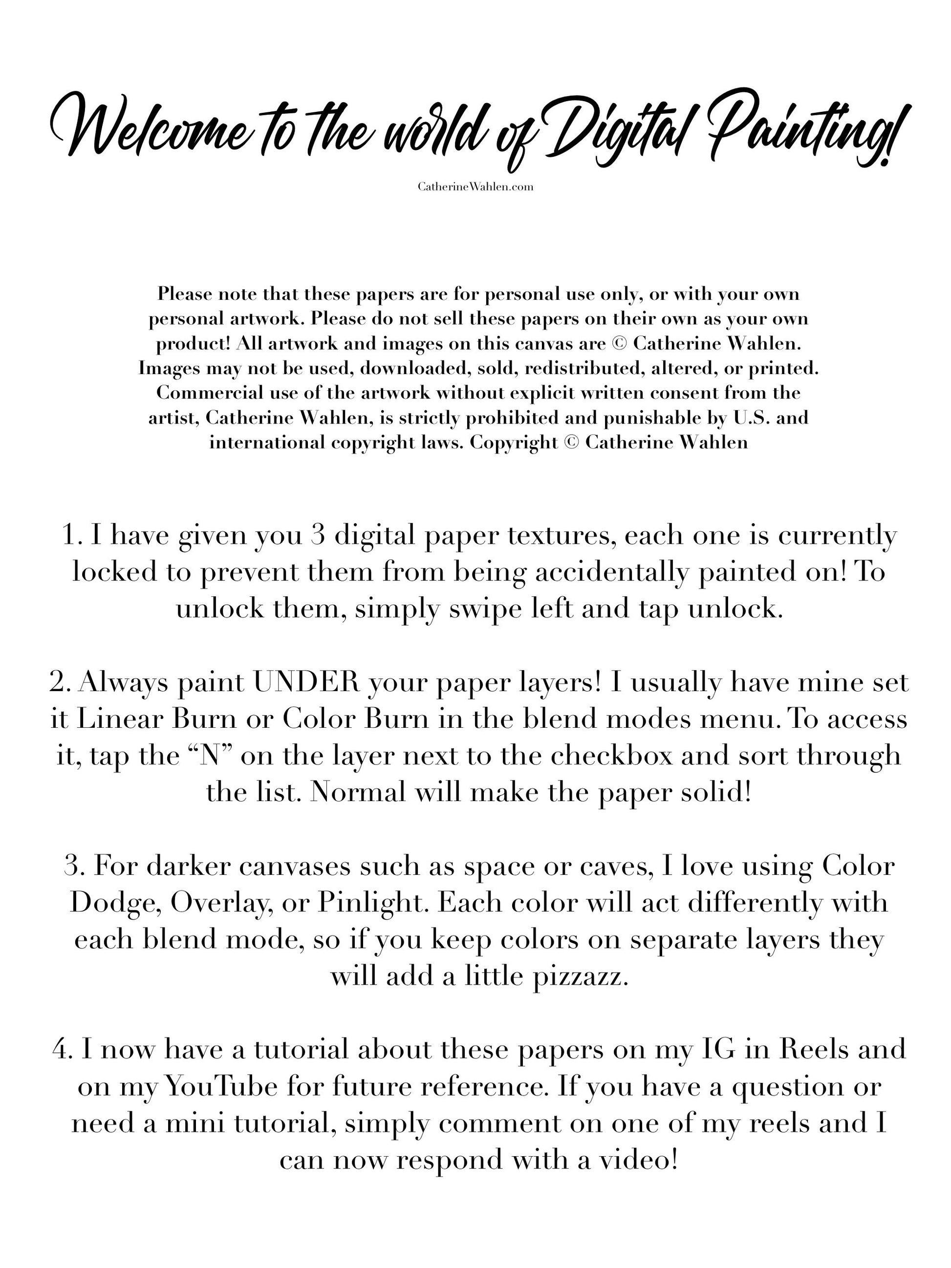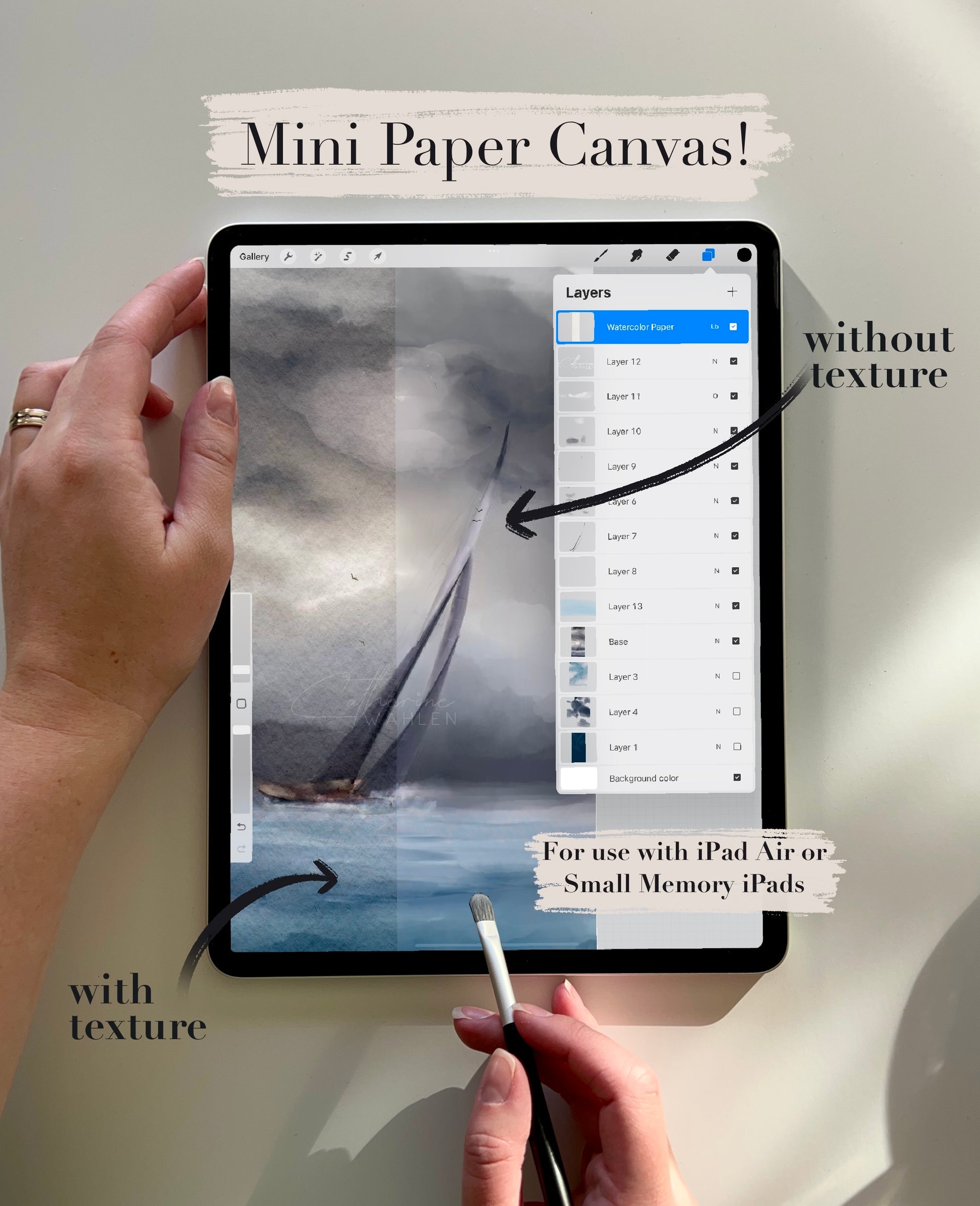 This MINI Procreate canvas includes 3 different types of Digital Paper, Watercolor Paper, Light Textured, & Handmade Speckled with a file size of 81.17MB. I have included a FAQ page breaking down my favorite ways to use them, as well as some pointers. Always paint UNDER your paper to get the optimal textured look like you see in my pieces.