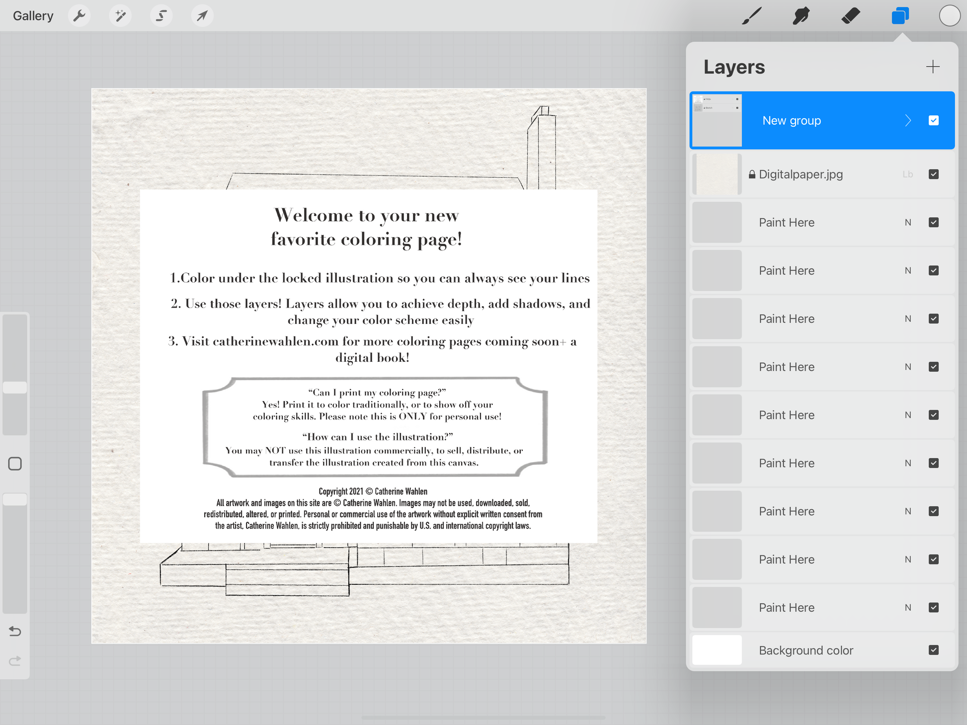 2. The coloring page comes with a paper layer, information layer, illustration layer, and paint me layers. The first three are locked, allowing you to paint without accidentally erasing lines. (feel free to toggle off the info layer)
