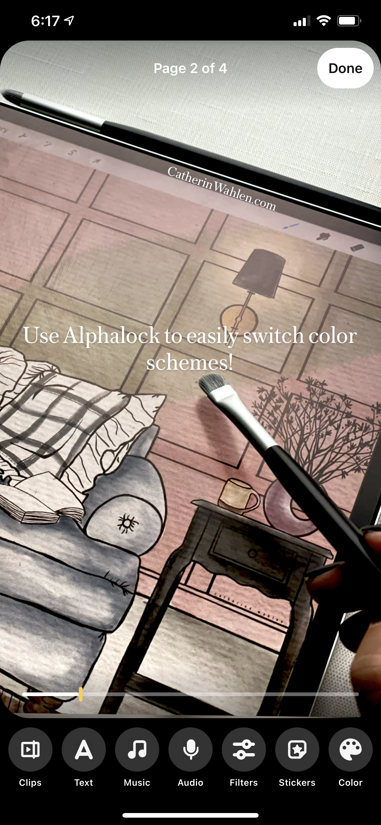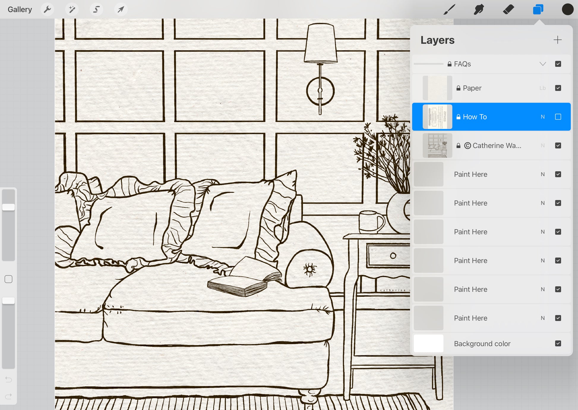 2. The coloring page comes with a paper layer, information layer, illustration layer, and paint me layers. The first three are locked, allowing you to paint without accidentally erasing lines. (feel free to toggle off the info layer)